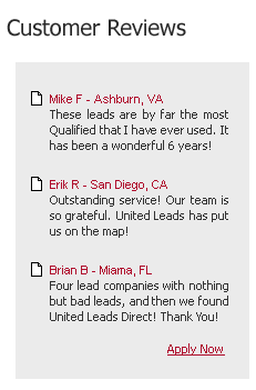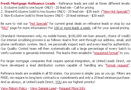 Client Login. Request More Information. Request More Information. Request More Information. United Leads Direct Homepage! Frequently Asked Questions. Choose Your Lead Type. This Weeks Hot Specials. Lead Pricing. Contacts. Client Login. Sitemap. Terms Of Use. Our Privacy Promise To You. United Leads Direct Homepage.